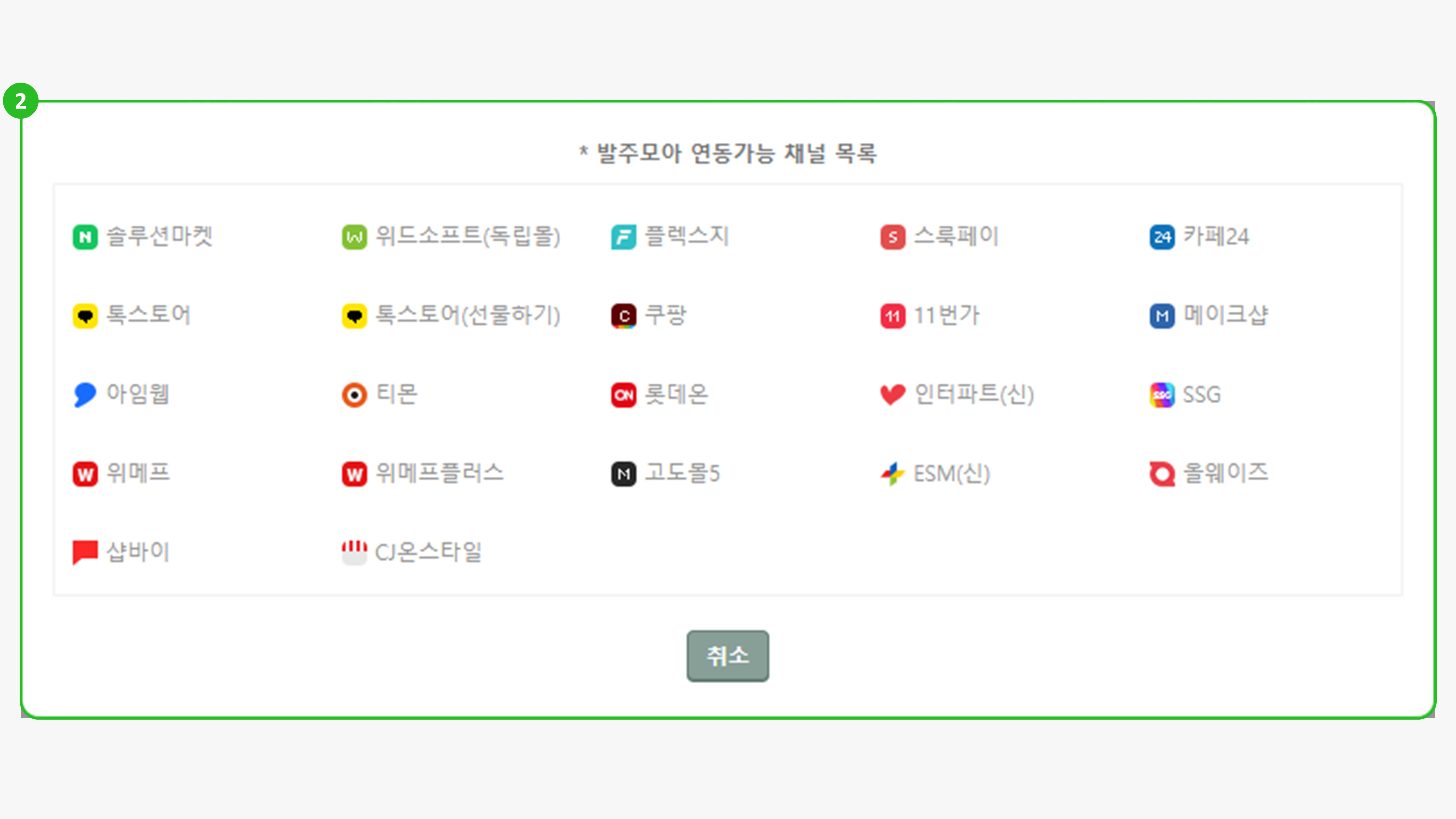 연동가능 채널보기 버튼을 통해 연동이 가능한 쇼핑몰 종류를 확인할 수 있습니다.