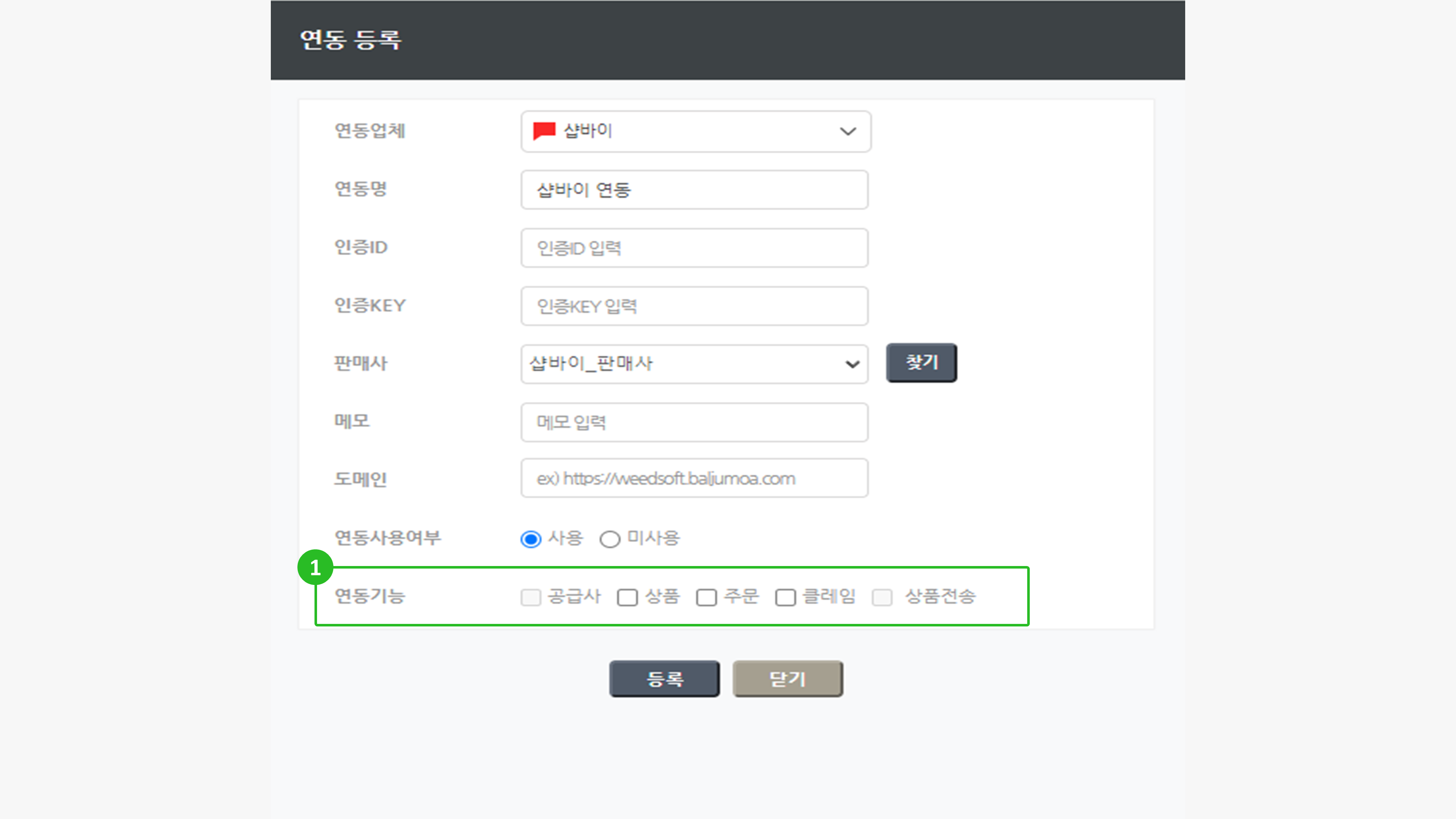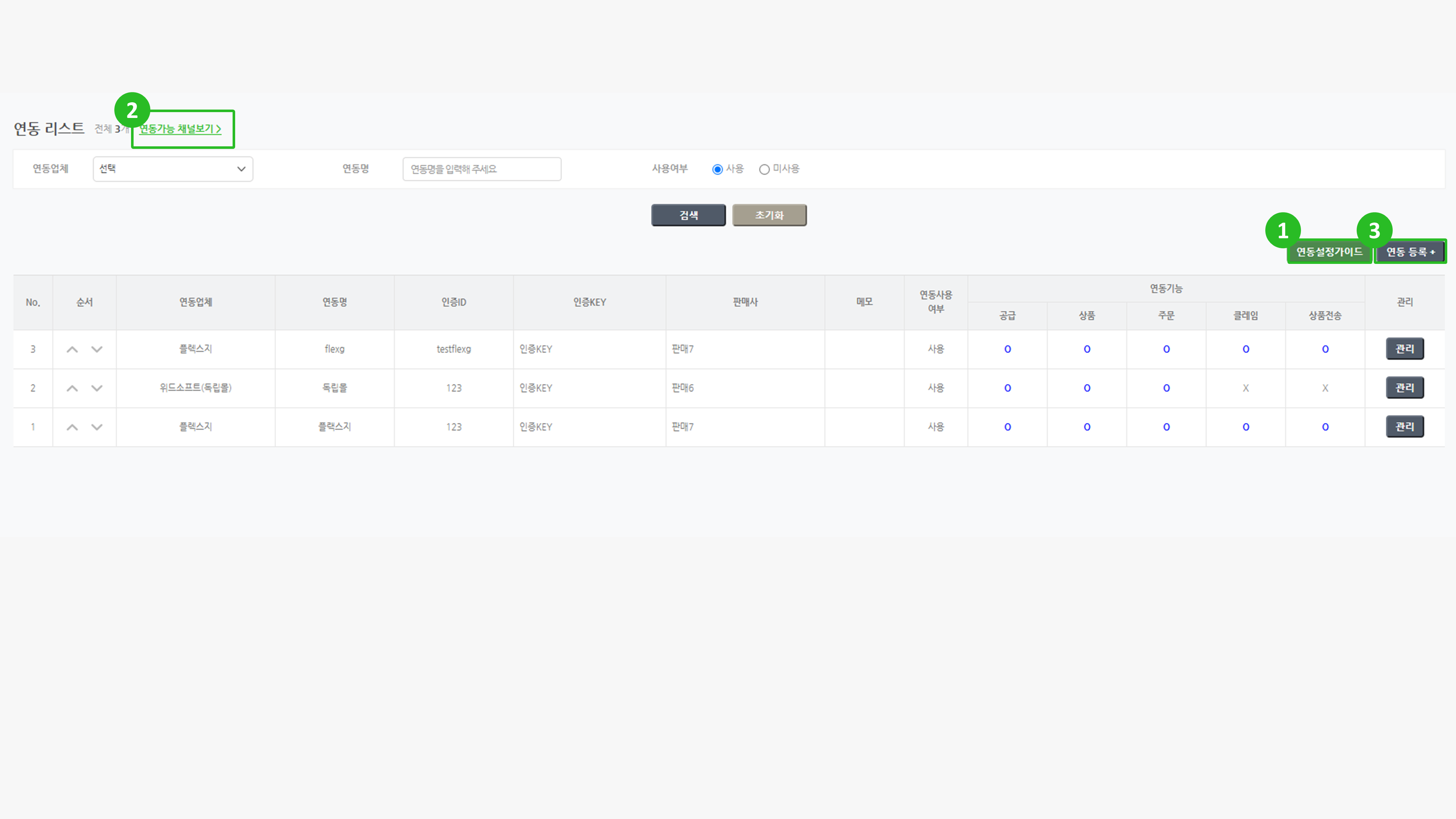 연동등록 버튼을 통해 연동 리스트를 추가합니다.