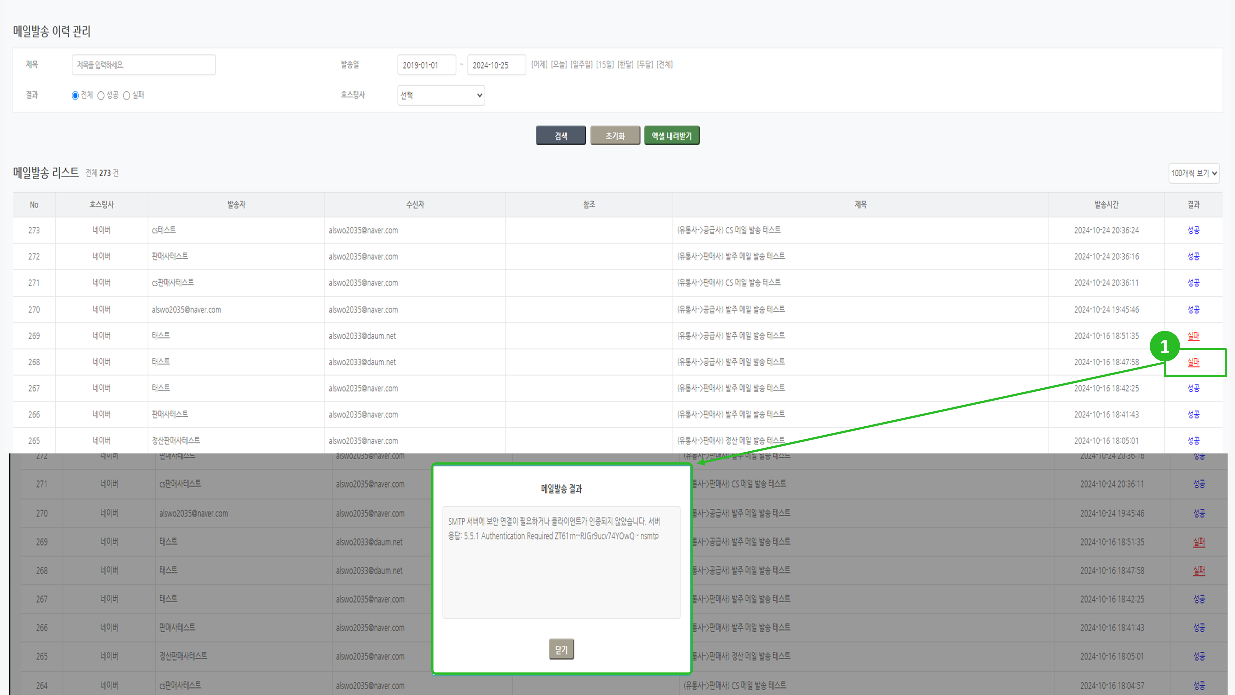 발송된 메일을 확인할 수 있으며 실패시 실패내용을 확인할 수 있습니다.