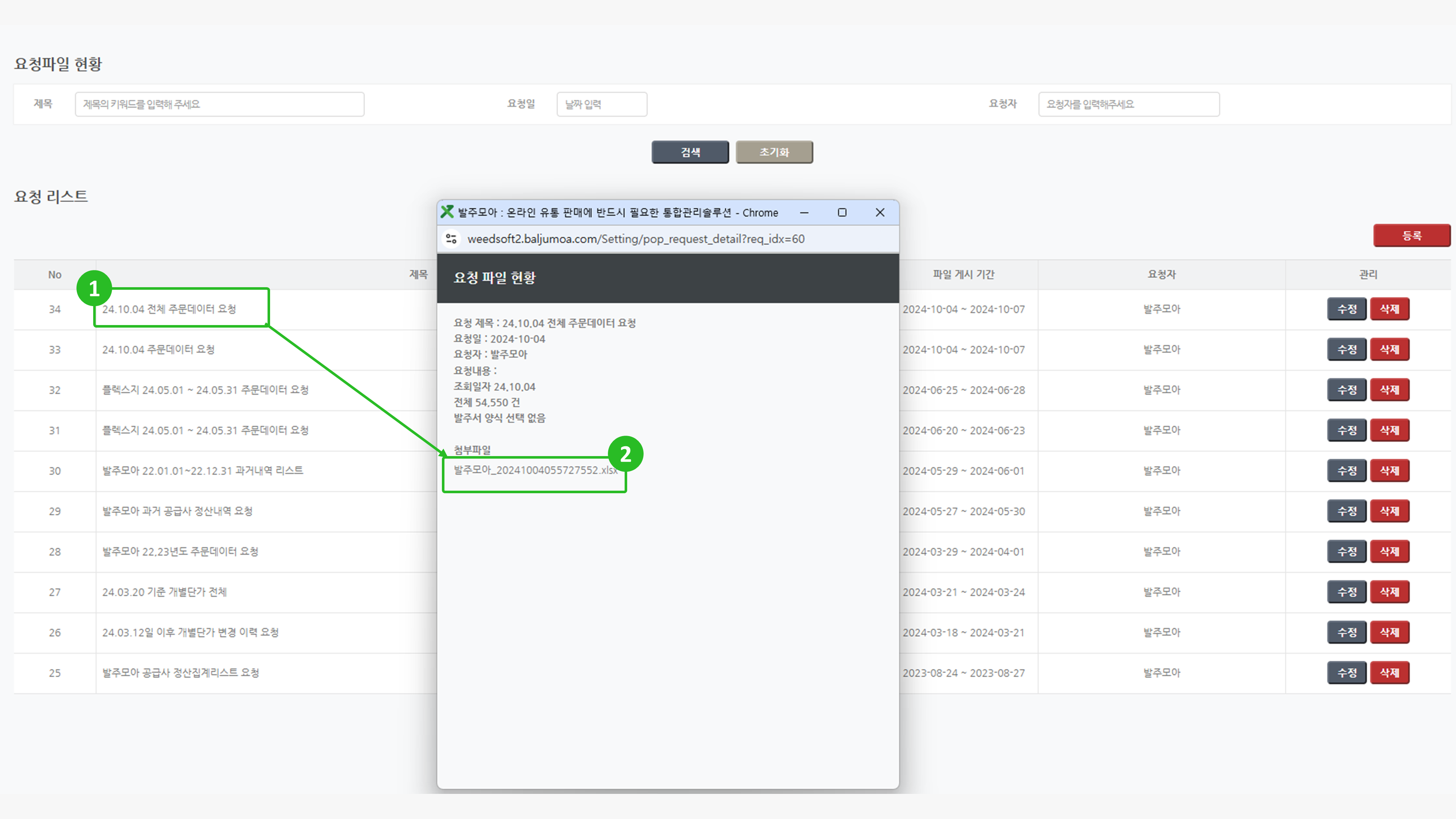 발주모아 고객센터로 파일요청을 한 후 요청한 파일을 받아볼 수 있는 메뉴입니다.