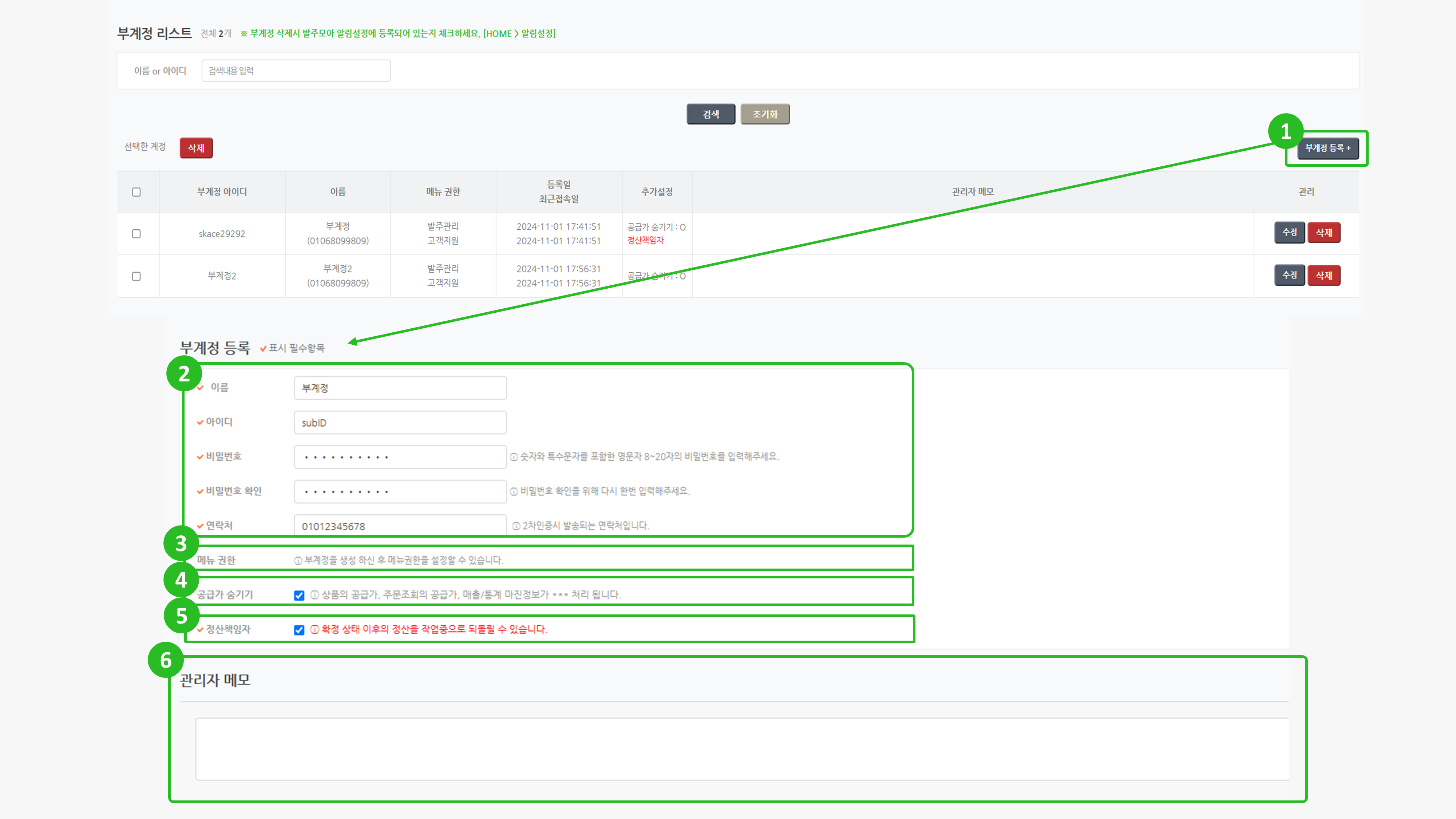 부계정 등록버튼을 눌러 새로운 부계정을 만들 수 있습니다.