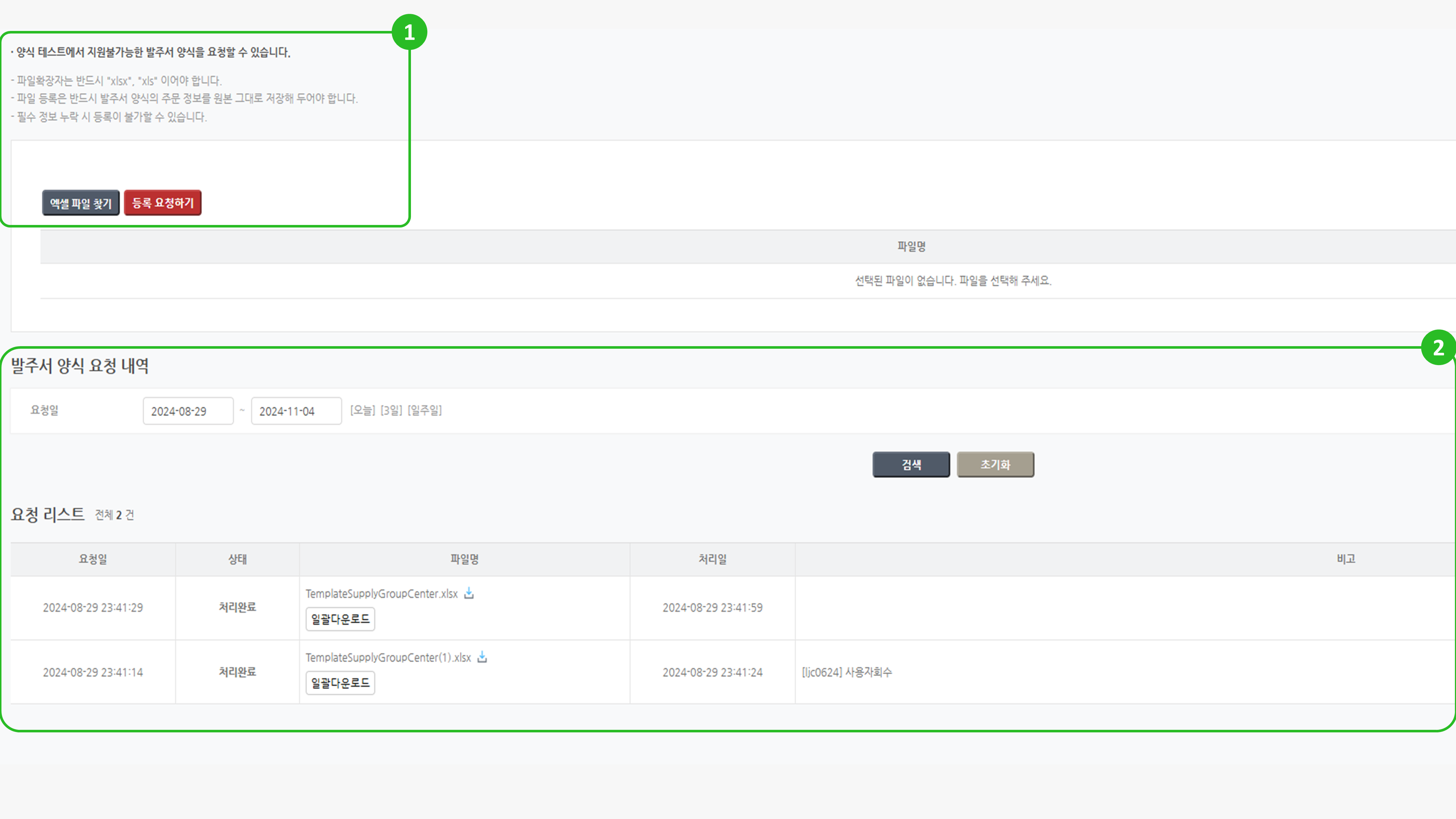 양식 요청한 파일을 볼 수 있으며, 처리결과를 확인할 수 있습니다.