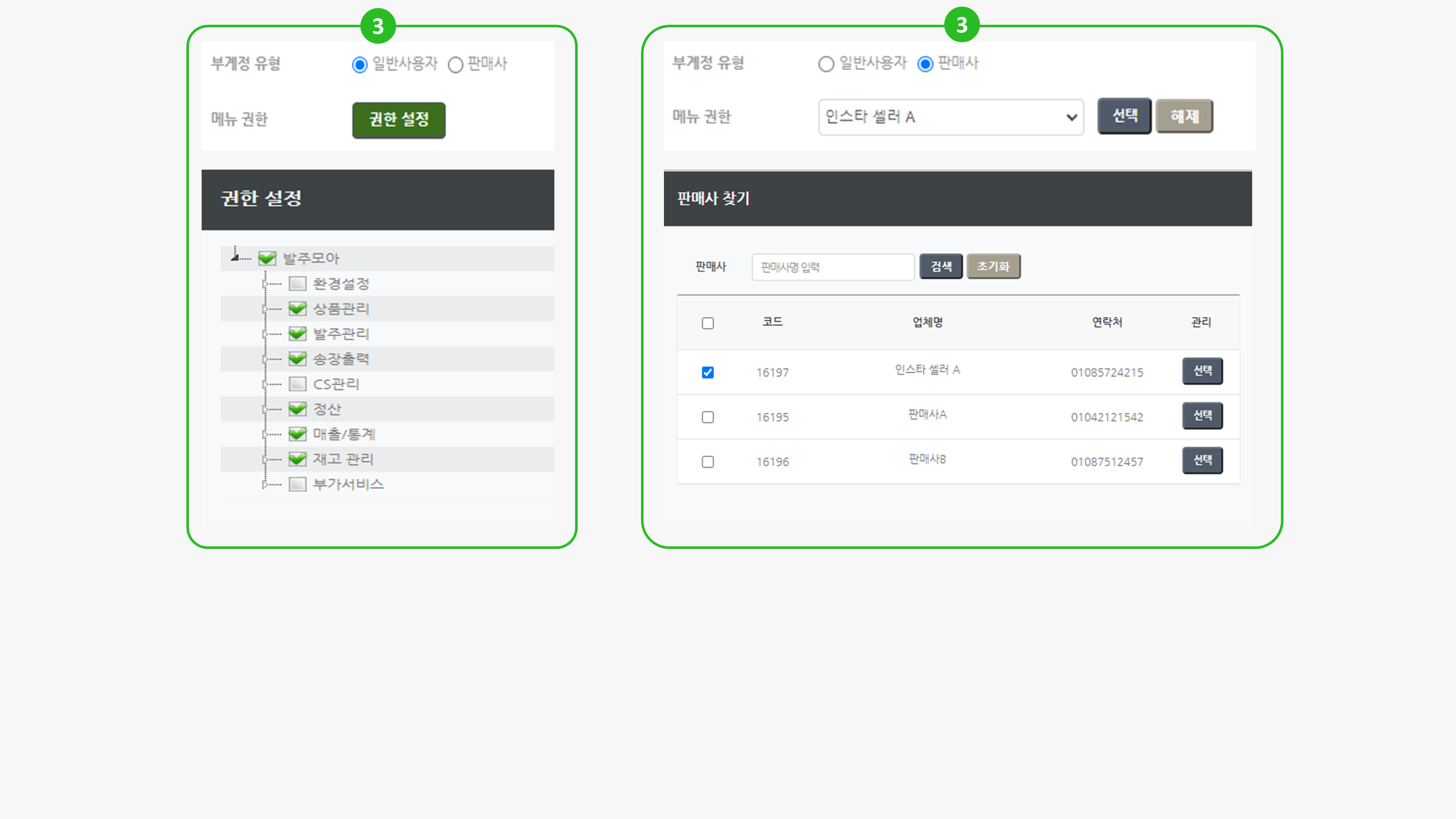 부계정의 유형에 따라 접근권한을 설정할 수 있습니다. 일반사용자 : 부계정의 메뉴권한을 선택적으로 부여할 수 있습니다. 판매사 : 매출처에 해당 부계정을 공유하여 업로드 목적으로 사용할 수 있습니다.