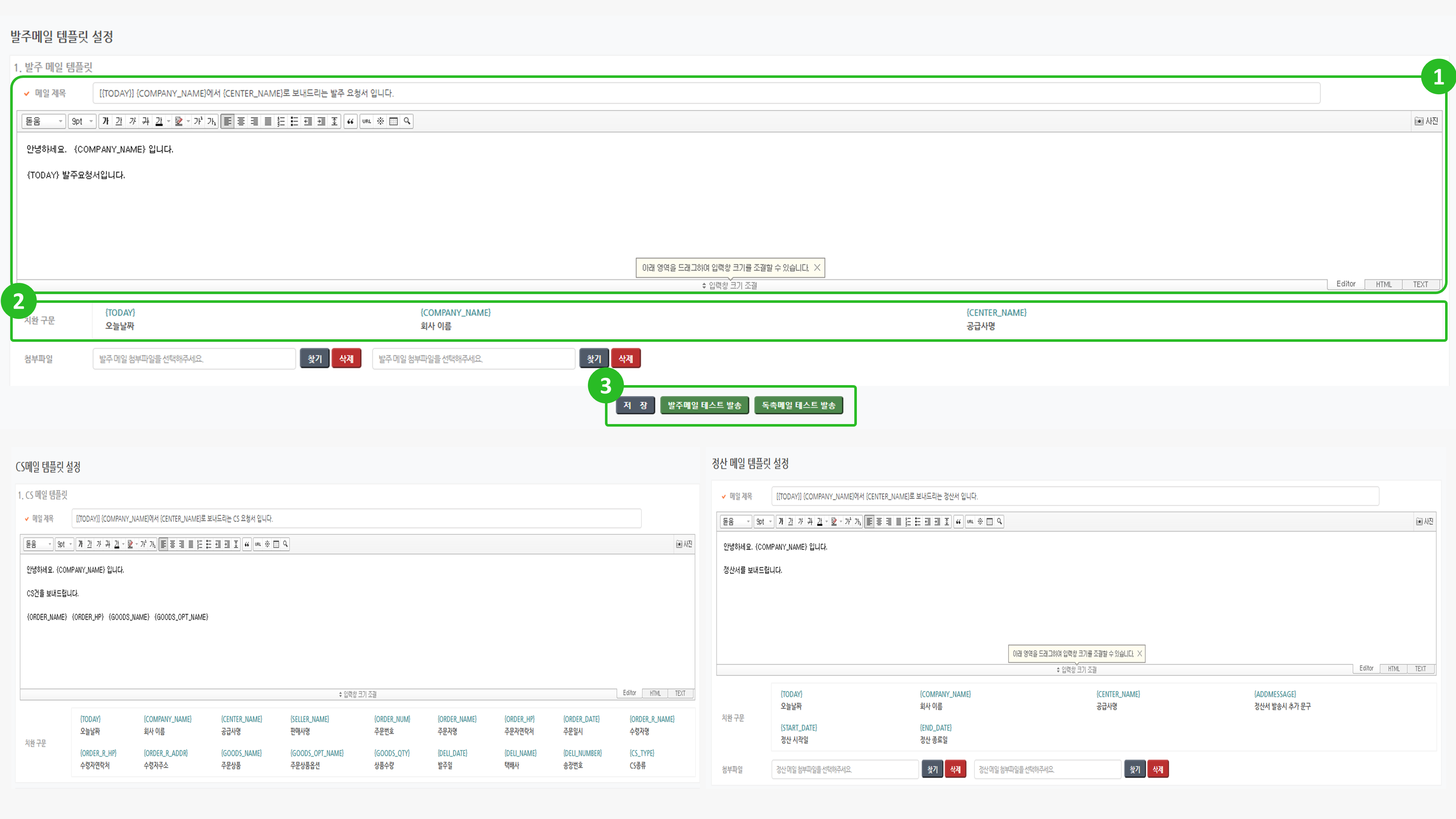 ③. 버튼 [저장] - 템플릿 설정 후 저장하는 기능입니다. [테스트 발송] - 설정된 템플릿으로 실제 메일을 테스트 발송하는 기능입니다.