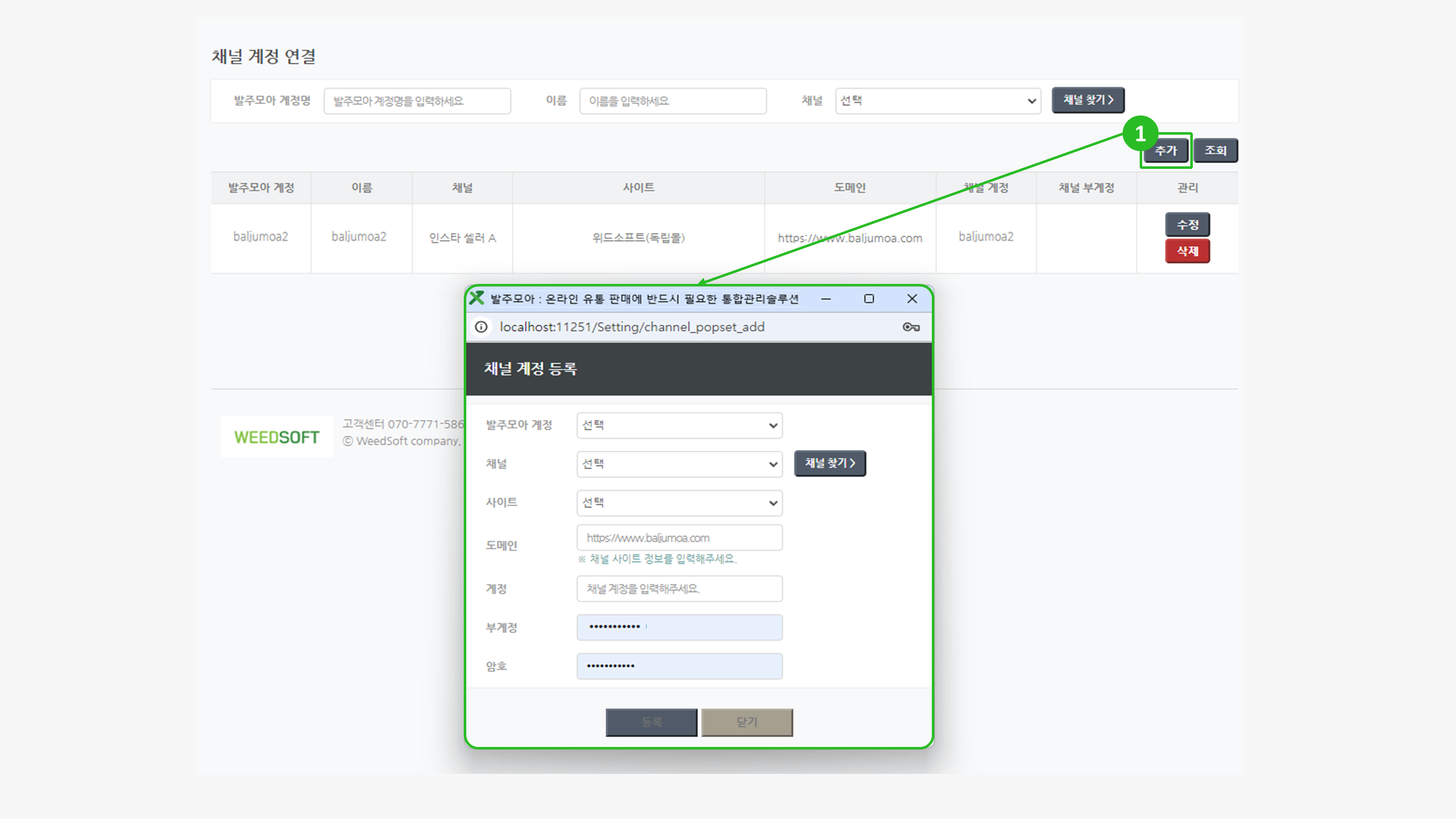 연결할 발주모아의 계정과 채널 정보를 입력 후 추가할 수 있습니다.
