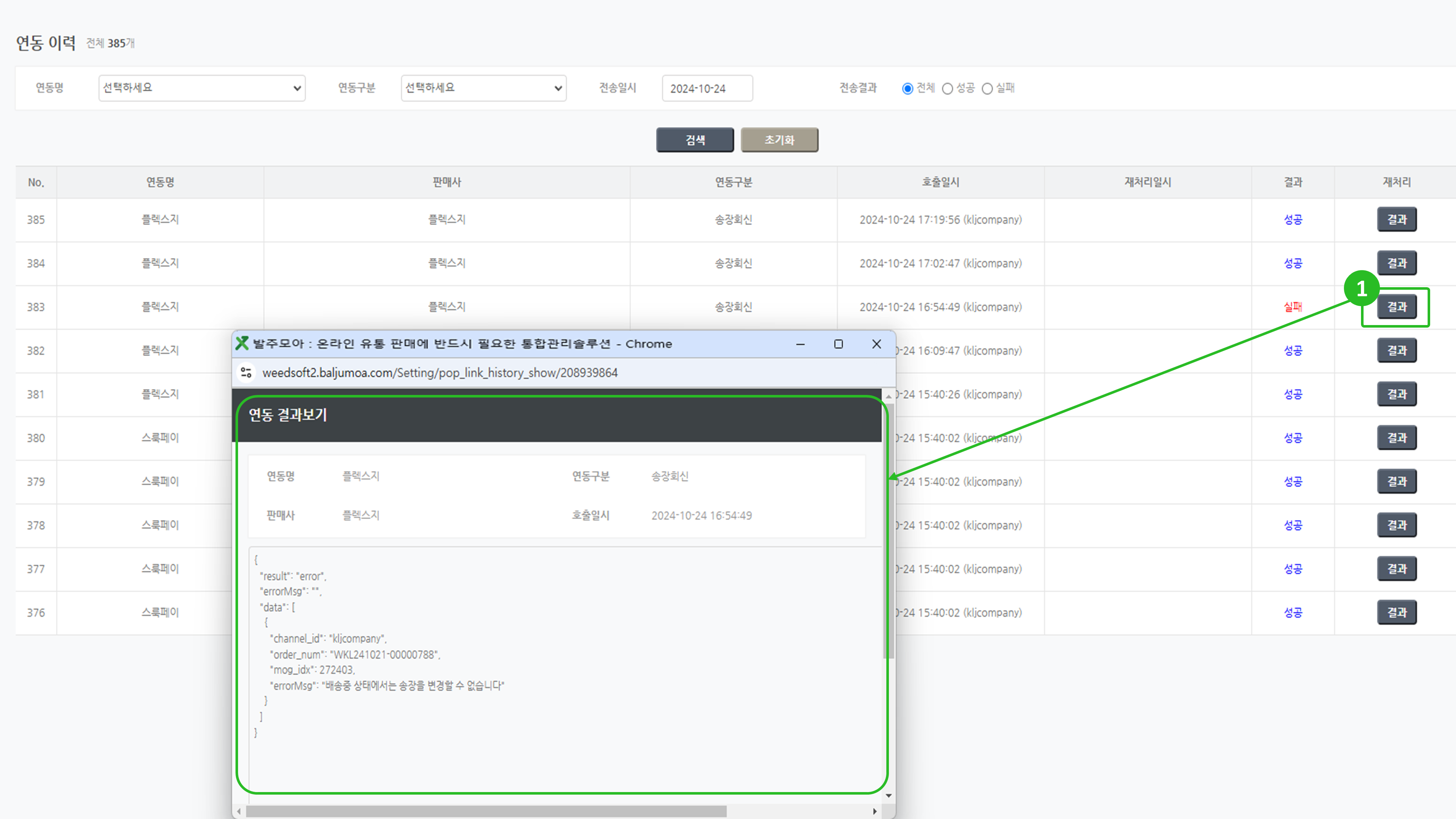 연동처리 결과를 알 수 있으며 성공,실패 내용을 확인할 수 있습니다.
