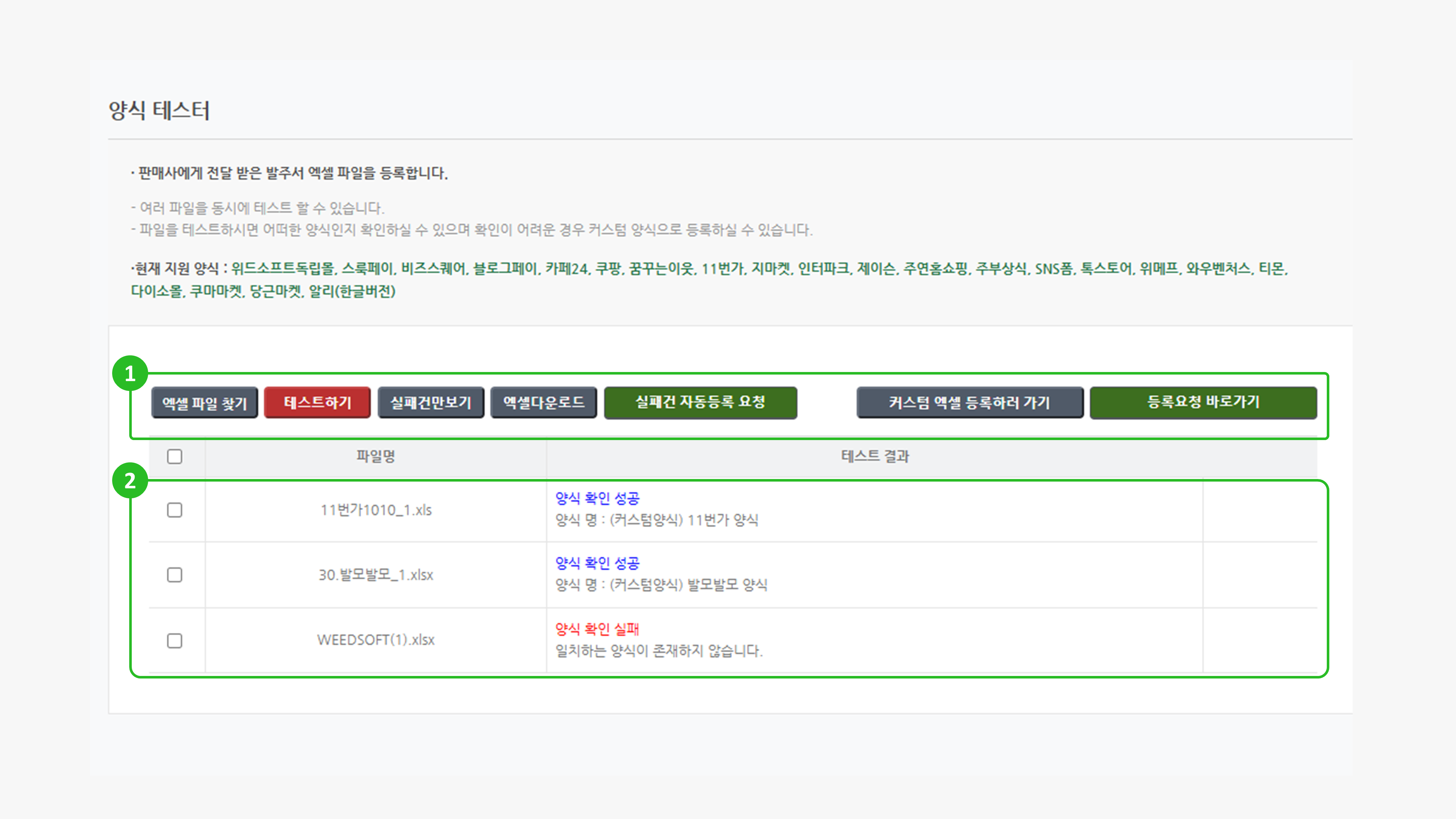 버튼 [엑셀 파일 찾기] - 등록 가능한 발주서 양식인지 확인하고싶은 발주서를 업로드 하는 버튼입니다. [테스트하기] - 테스트하기 버튼을 클릭 하여 등록된 양식인지 확인 하는 기능입니다. [실패건만보기] - 양식 확인 실패한 발주서 양식만 확인할 수 있는 기능입니다. [엑셀다운로드] - 테스트 결과를 엑셀 다운로드 하는 기능입니다. [실패건 자동등록 요청] - 테스트 결과 실패한 양식들을 발주모아에 등록 요청 하는 기능입니다. [커스텀 엑셀 등록하러 가기] - 환경설정 - 양식 템플릿 등록 화면으로 이동하는 버튼입니다. [등록요청 바로가기] - 환경설정 - 양식 등록 요청 화면으로 이동하는 버튼입니다.