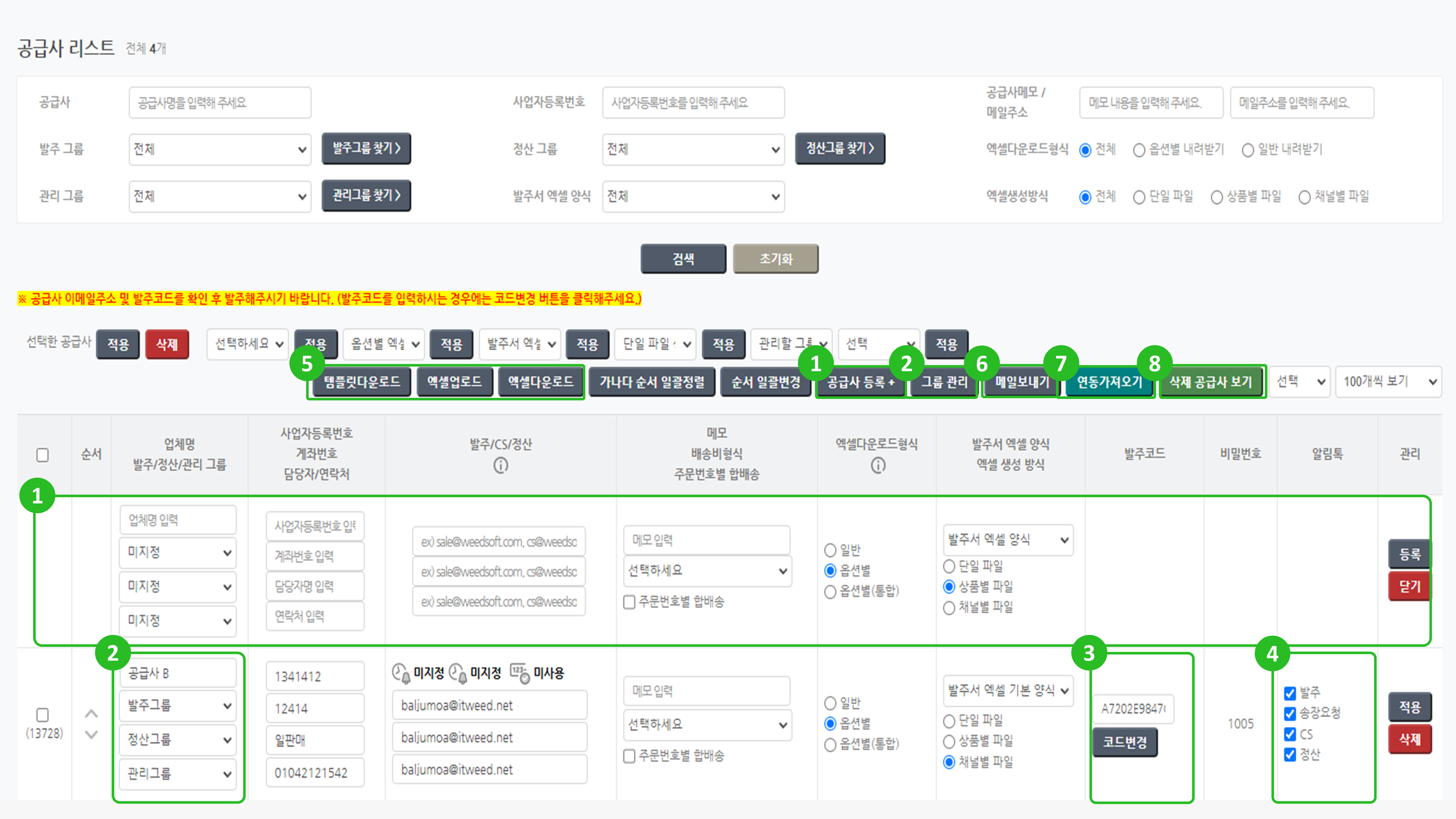 등록된 업체의 메일로 공지사항 등을 메일발송하는 기능입니다. 삭제된 판매사를 확인할 수 있고 복원 시킬 수 있습니다. 판매사 별로 상품의 단가를 다르게 설정할 수 있는 기능입니다. (단가그룹에 속해있는 판매사의 단가 변경시 해당 단가그룹에 속해있는 모든 판매사의 단가가 일괄 변경됩니다.)