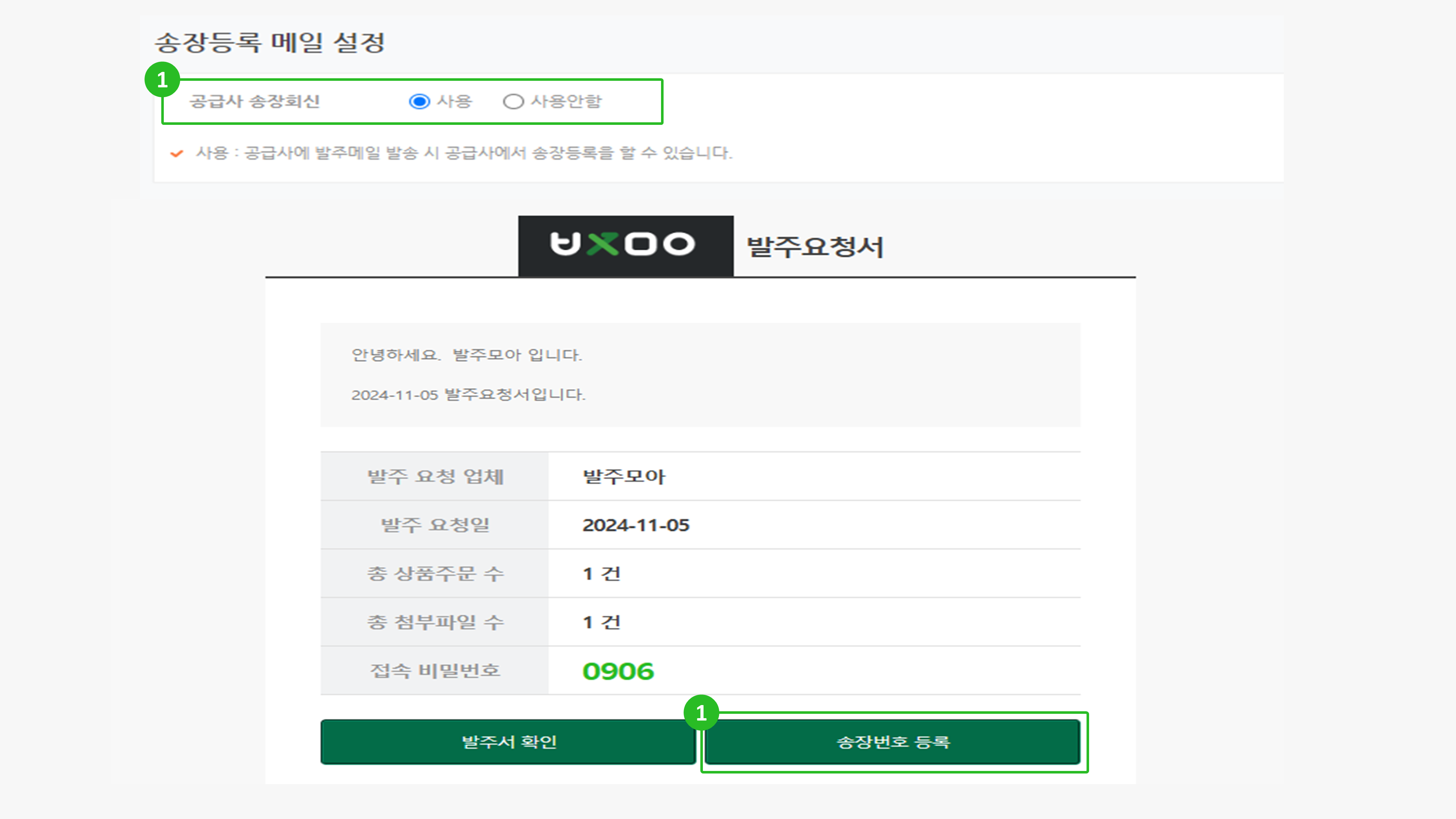 공급사 송장회신을 사용으로 체크했을 경우 발주서 메일에 송장번호 등록 버튼이 추가됩니다. 공급사는 이 버튼을 통해 송장번호를 등록할 수 있어 사용하시는 것을 추천드립니다.