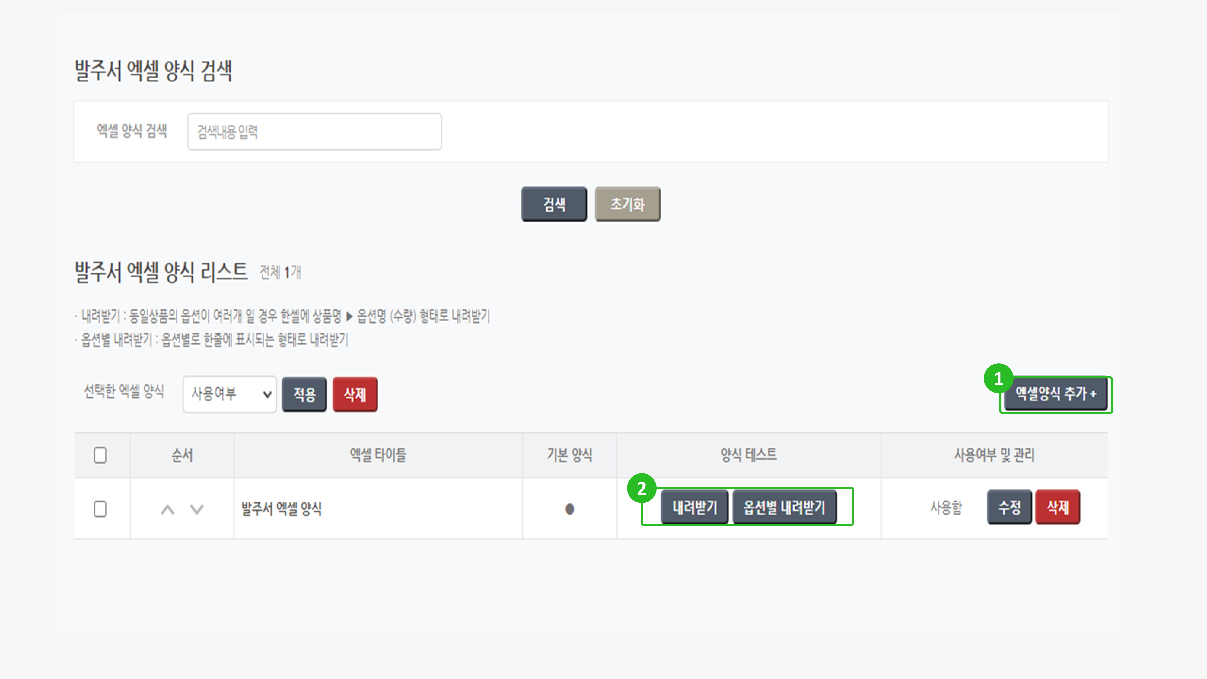 발주서 및 엑셀 다운로드 양식을 새로 만드는 기능입니다.